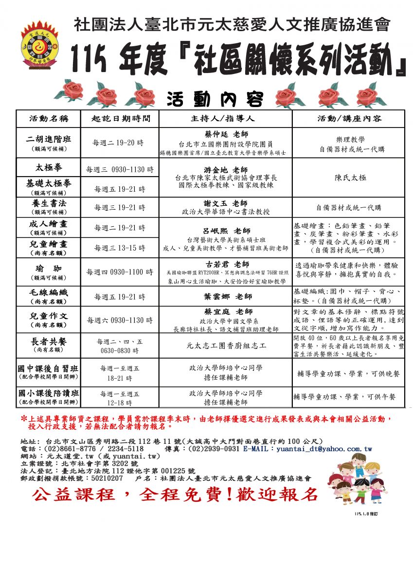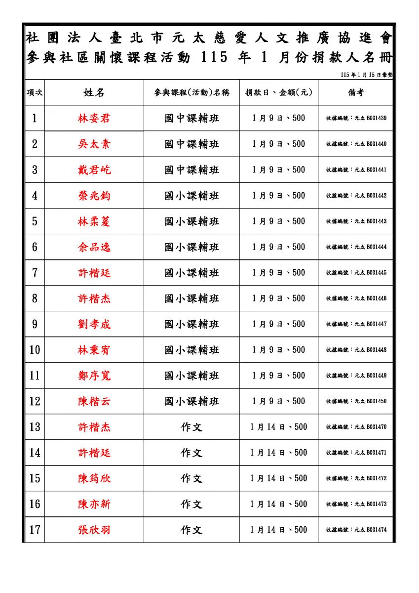 社團法人臺北市元太慈愛人文推廣協進會 參與社區關懷課程115年1月份捐款人名冊
