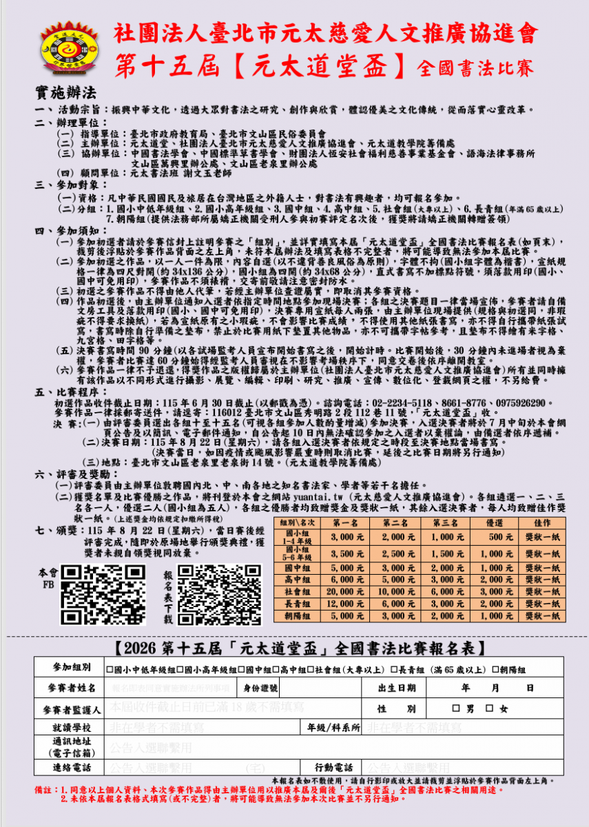 第15屆元太道堂盃全國書法比賽開始報名囉!!